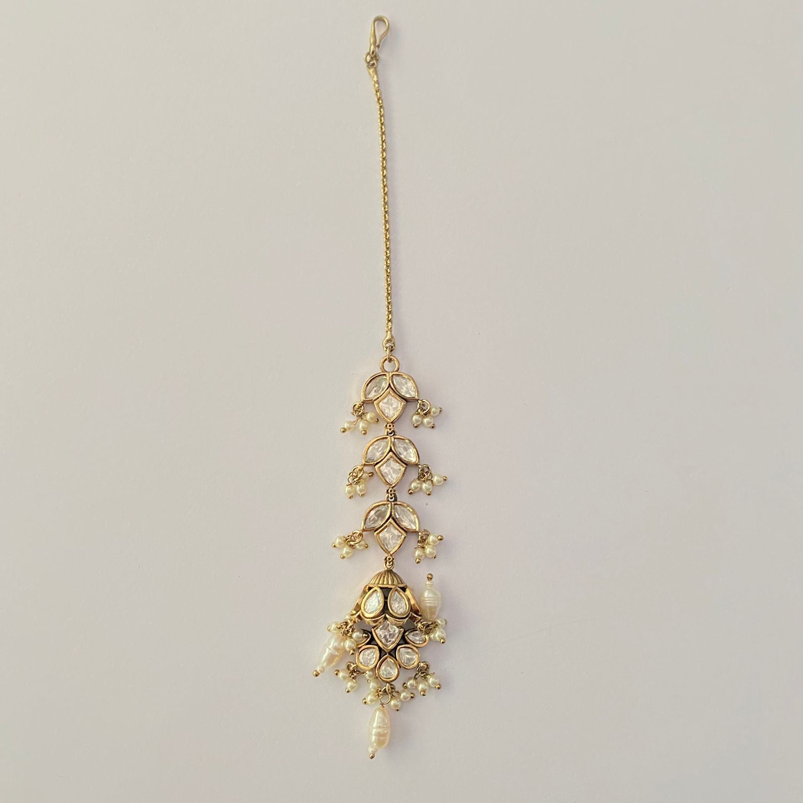 Antique Gold Plated Polki with pearl Drop Mangtika
