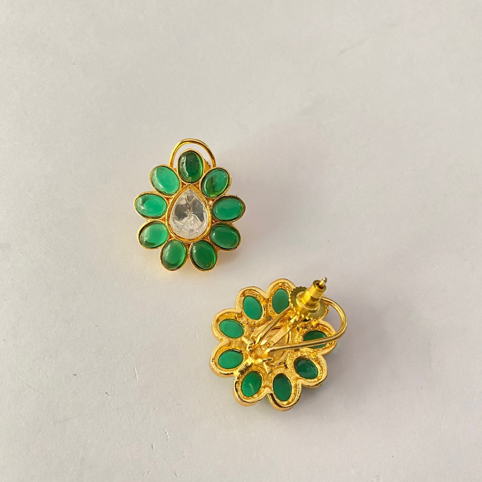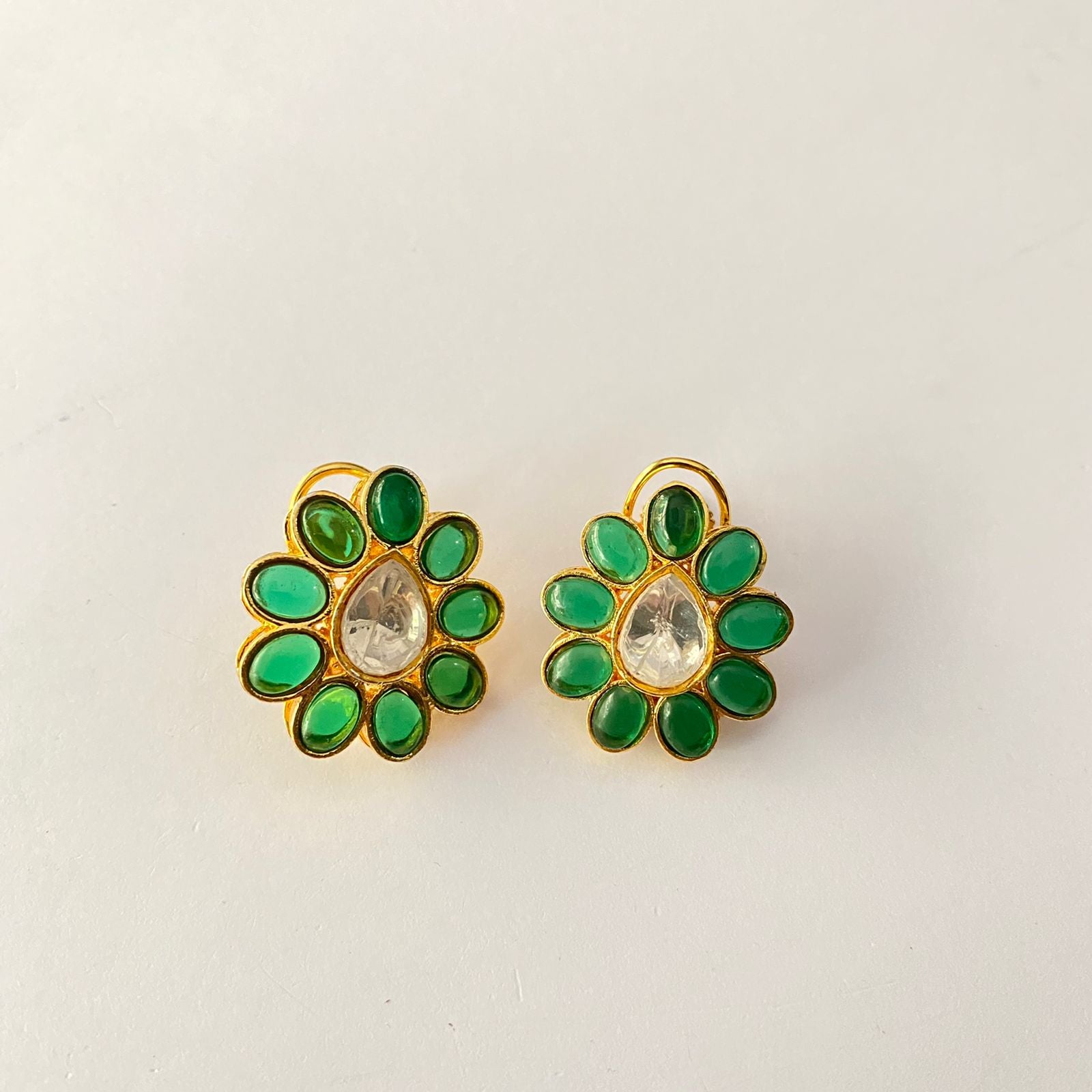 Gold Plated Green Polki With Back Clip Stud
