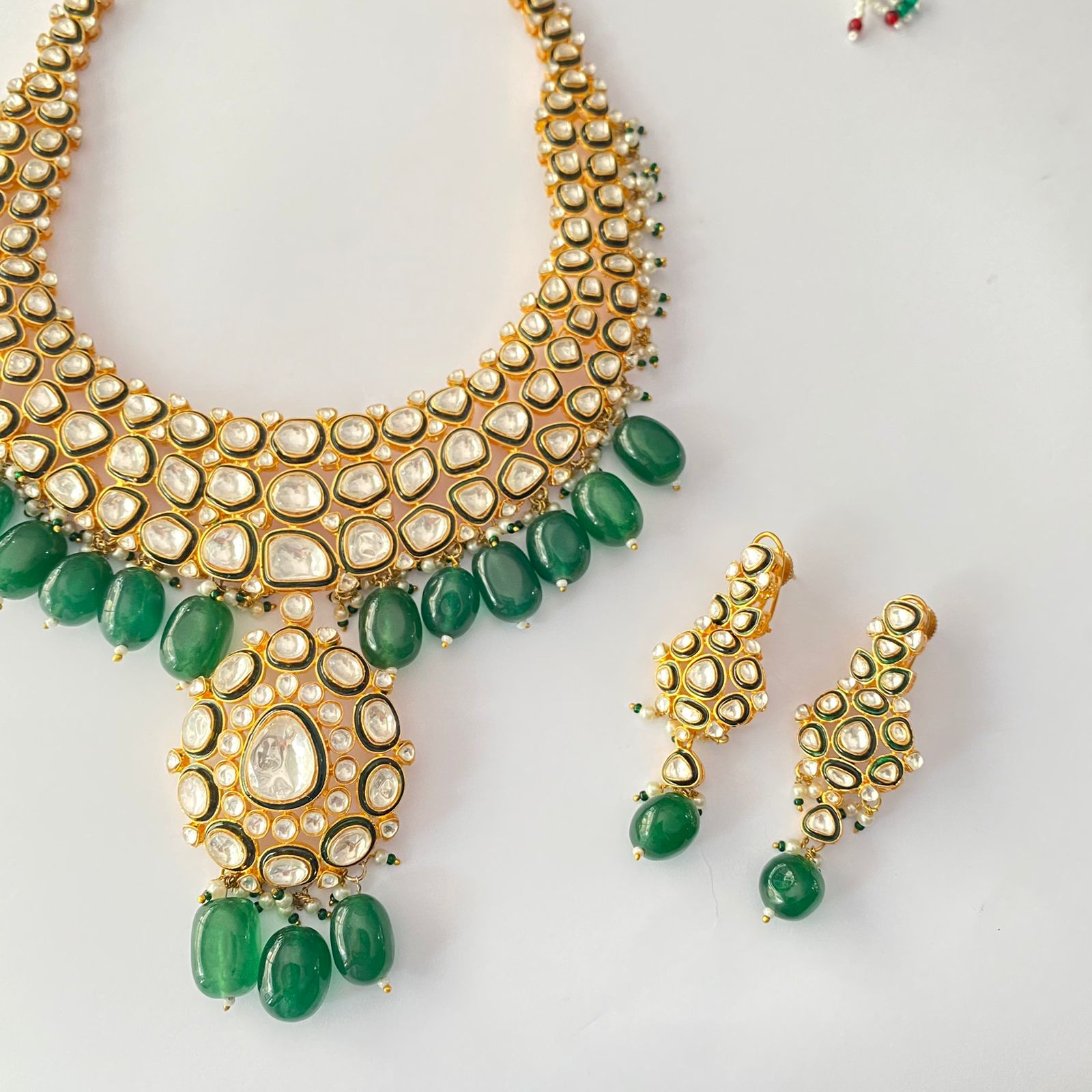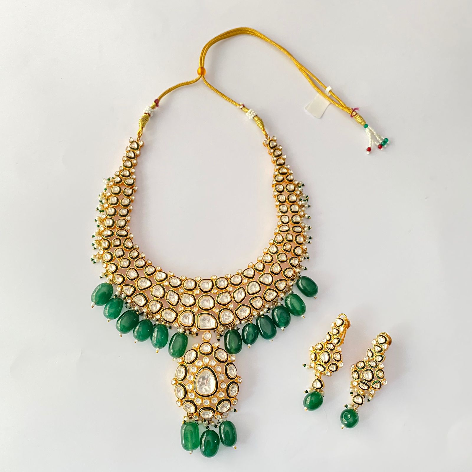 Gold Plated Kundan Polki Drop Green Necklace Set