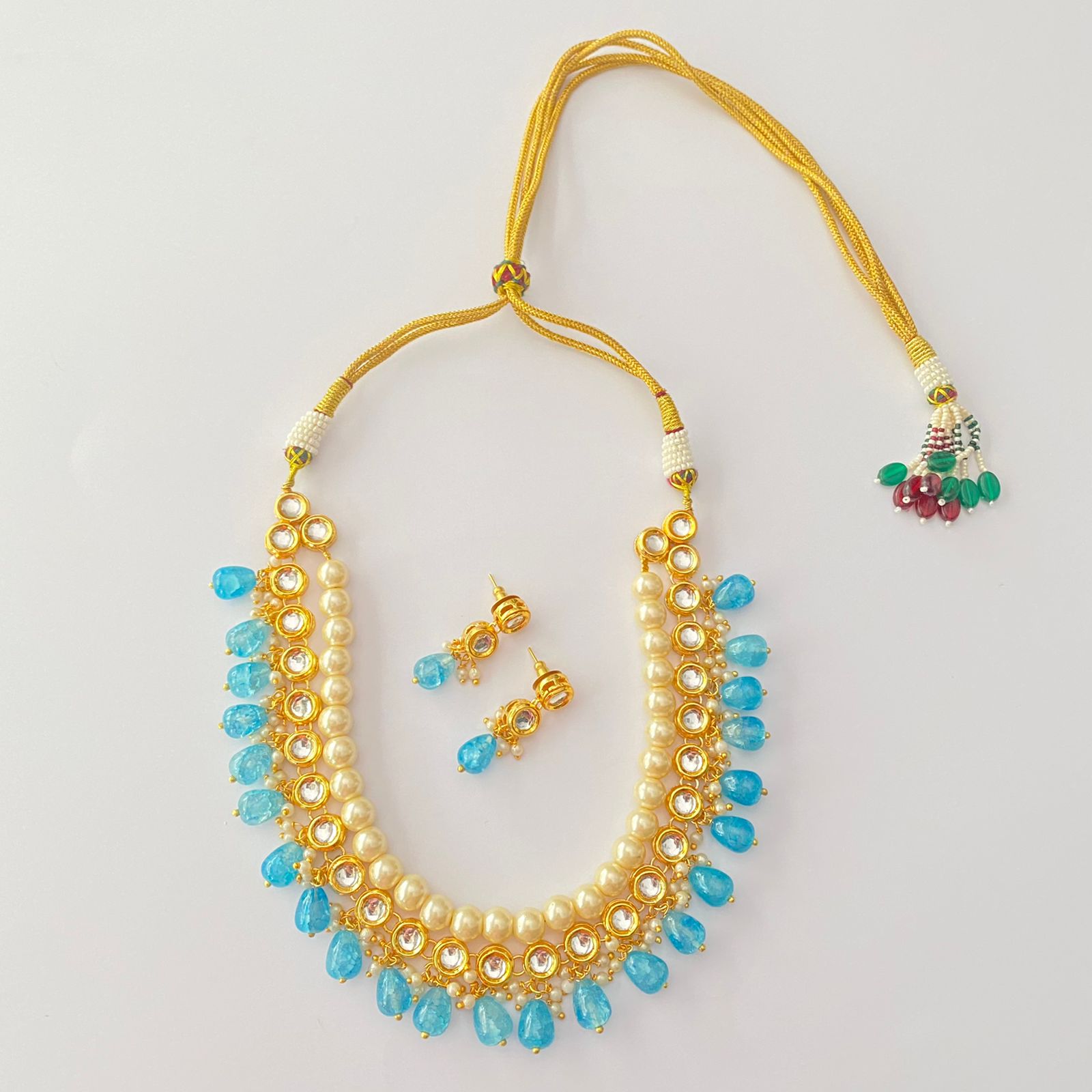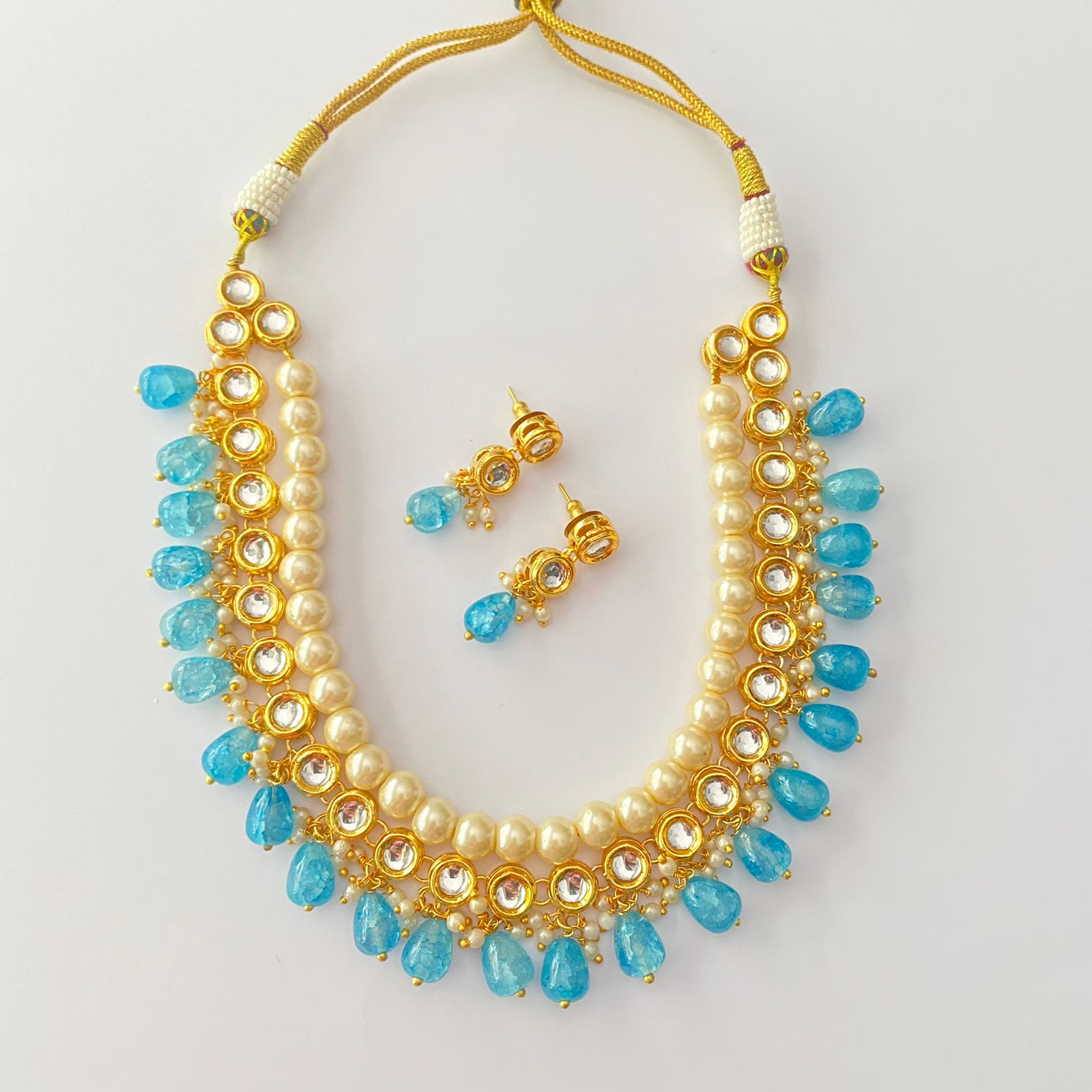 Kundan Pearl Aquamarine Drop Stone Necklace Set