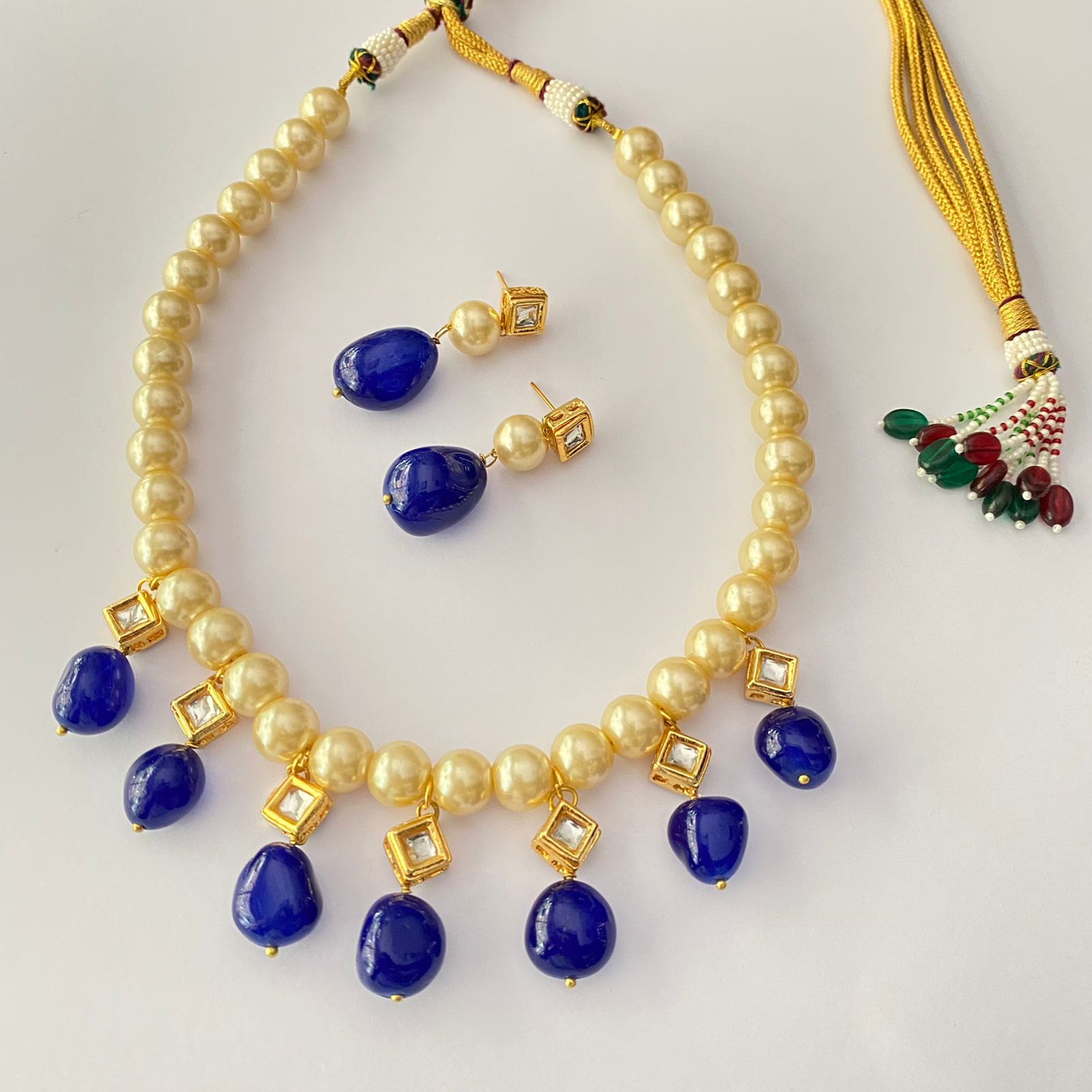 OFF WHITE PEARL BLUE SAPPHIRE KUNDAN GOLD PLATED NECKLACE WITH EARRING