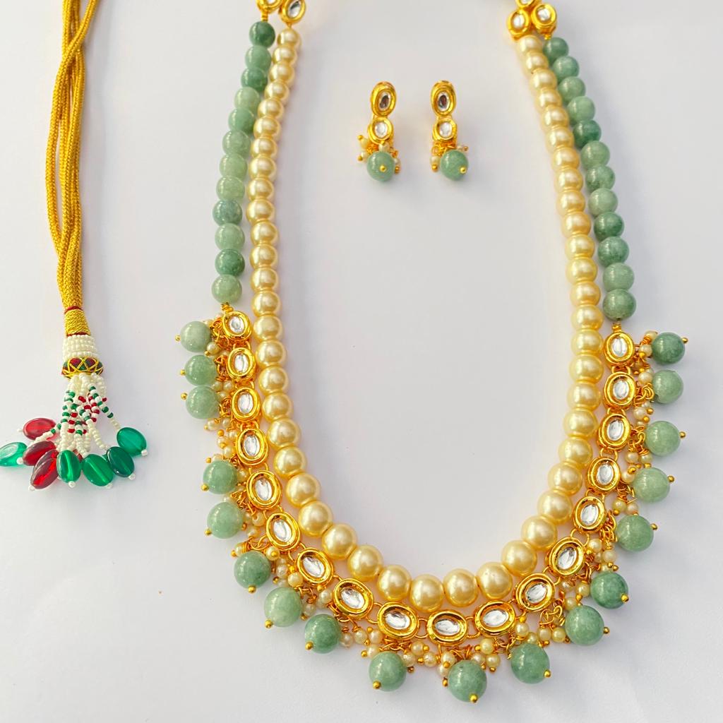 Off White Pearl Kundan Gold Plated with Green stone Necklace set