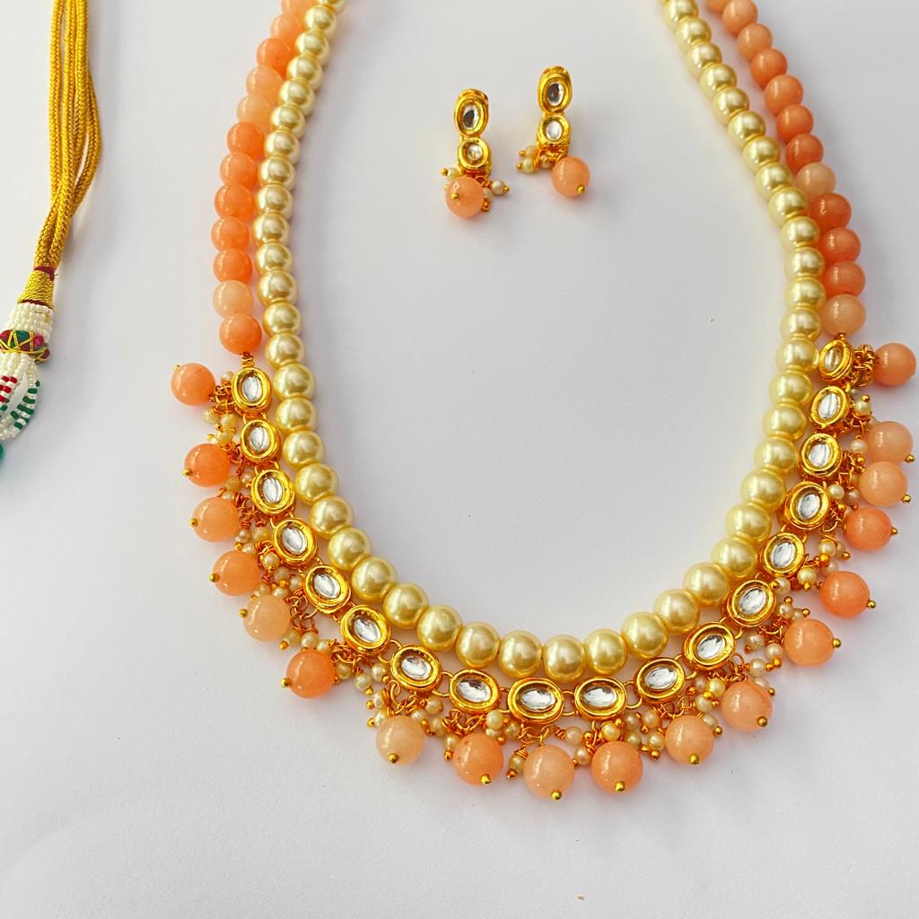 Off White pearl orange stone with kundan gold plated Double string Necklace