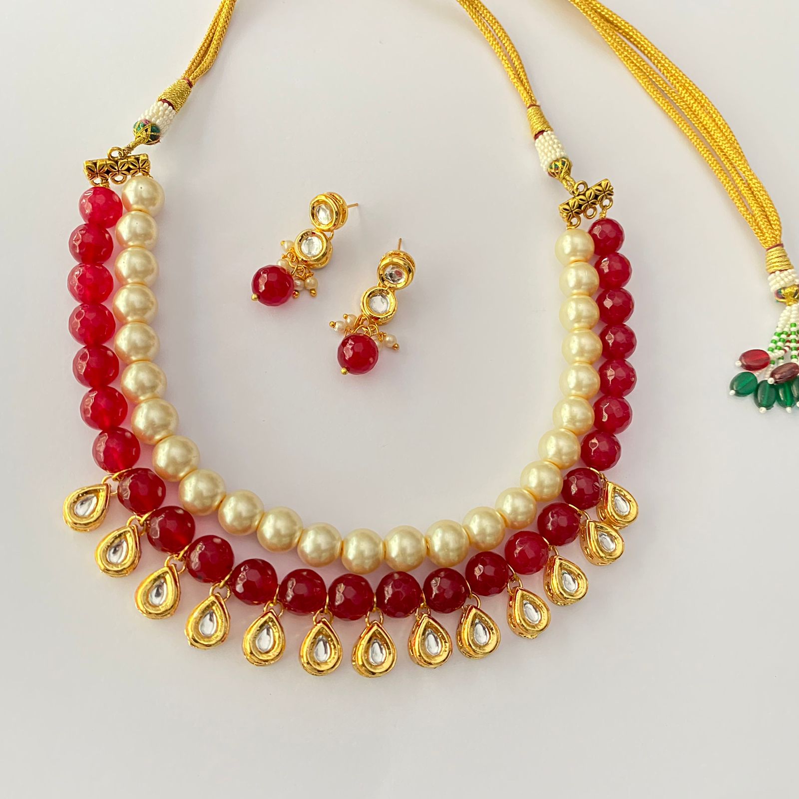 OFF-WHITE PEARL RUBY STONE KUNDAN DOUBLE STRING NECKLACE WITH EARRING