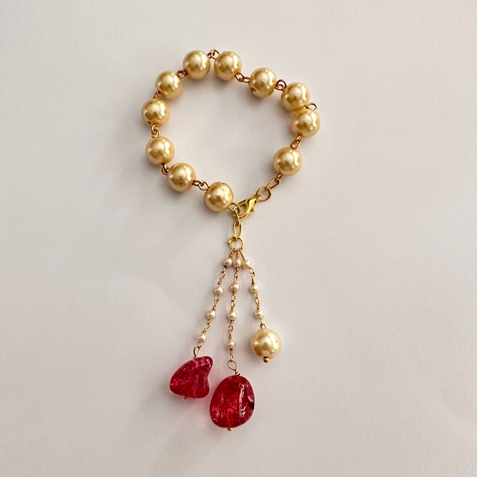 OFF-WHITE PERAL GOLD PLATED CHAIN WITH RUBY STONE BRACELET FOR WOMEN